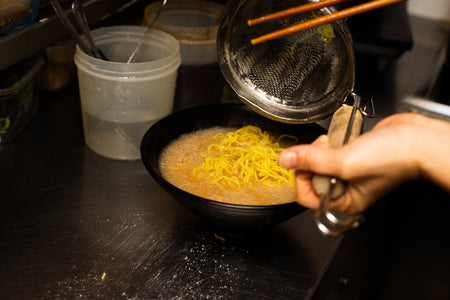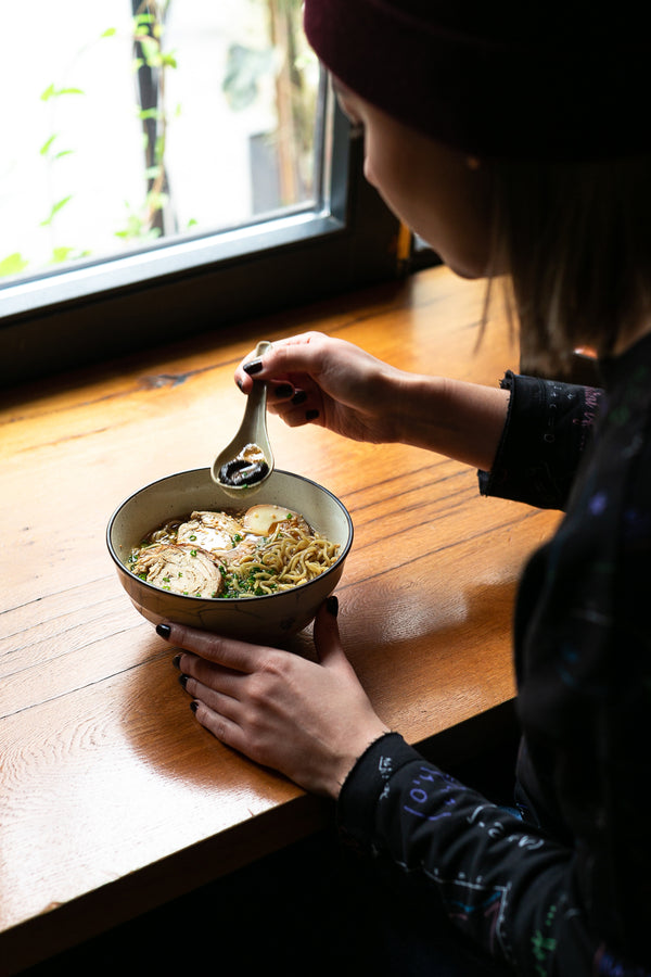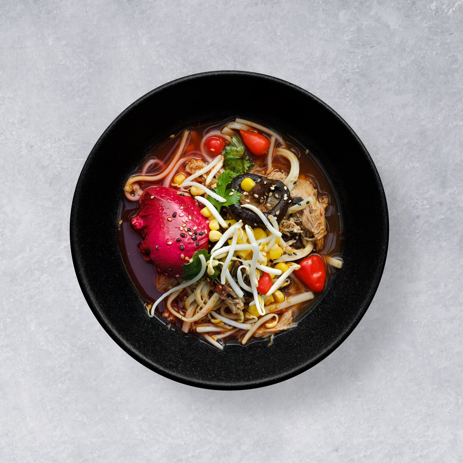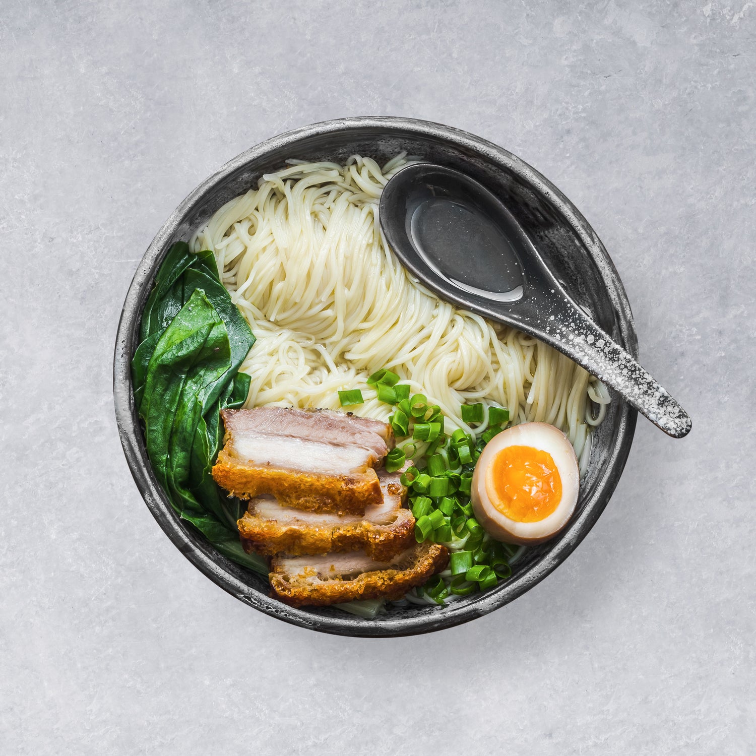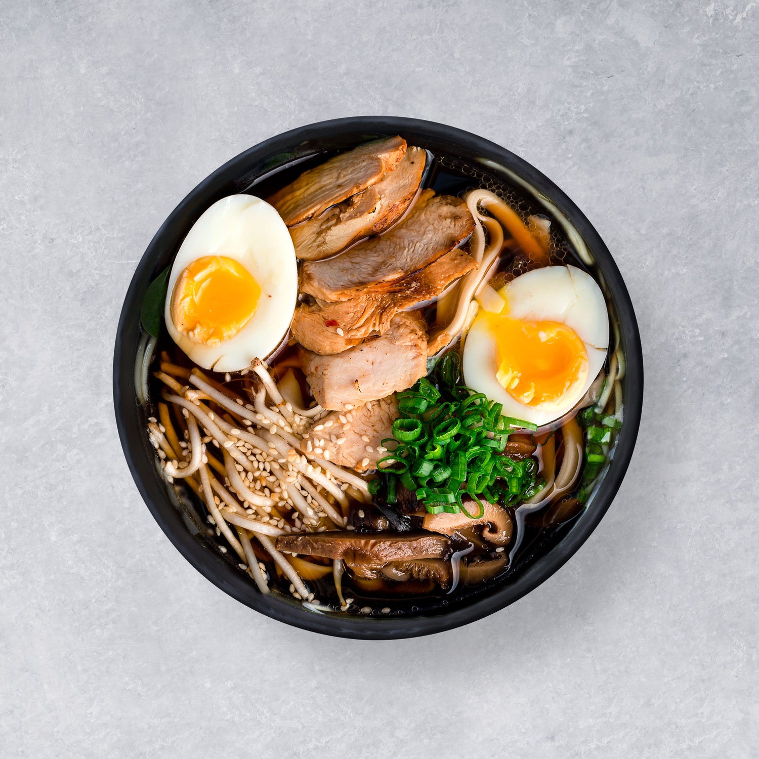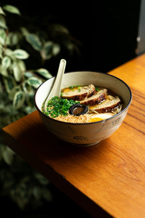 Chicken & fish broth, kakuni pork, egg, scallions, sesame, bamboo, corn, garlic chip and butter and chili oil.