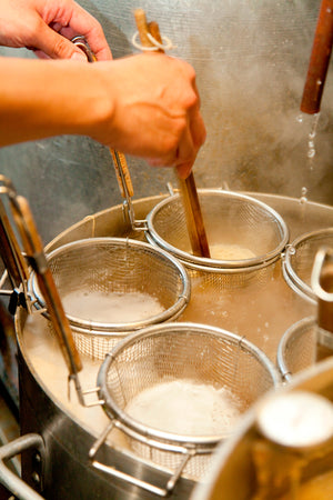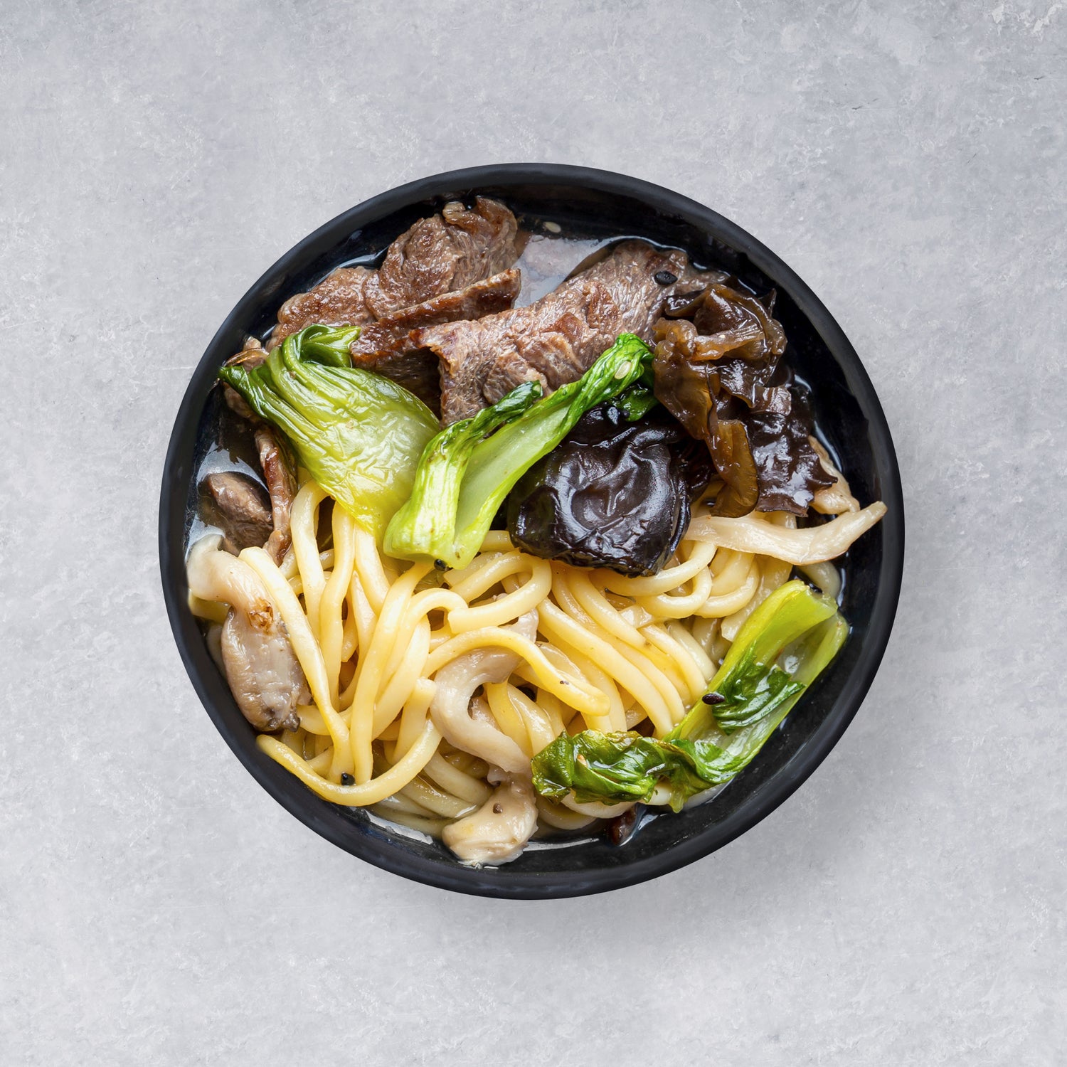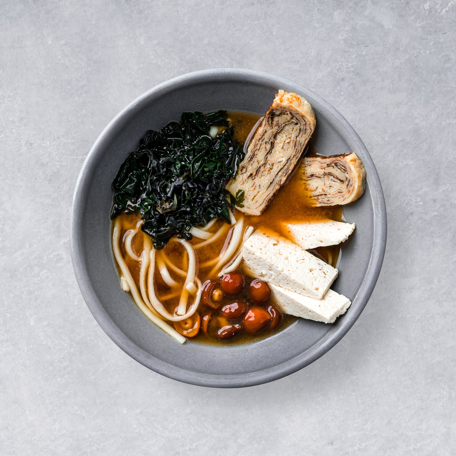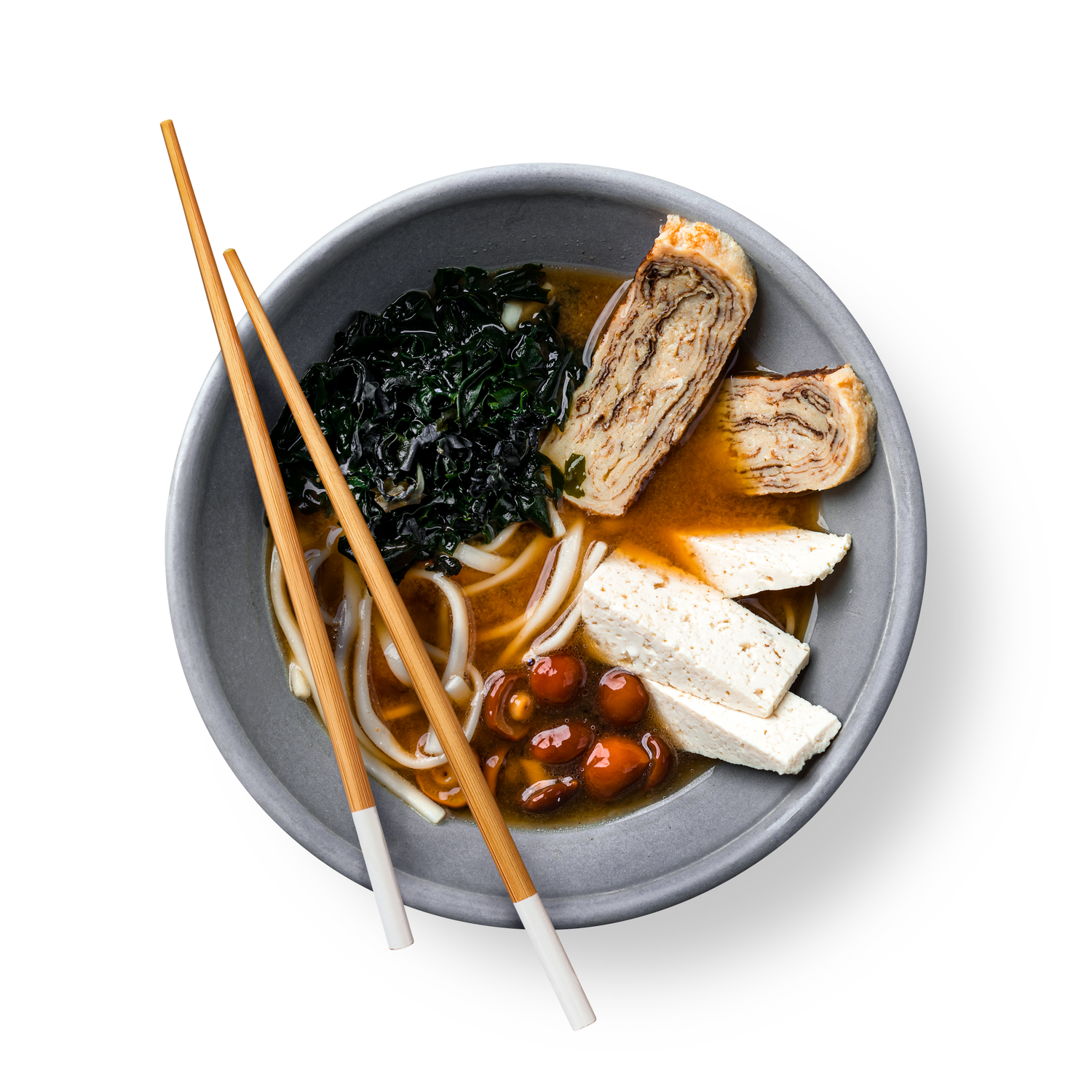 Vegetarian broth, roasted tofu and shiitake mushrooms.